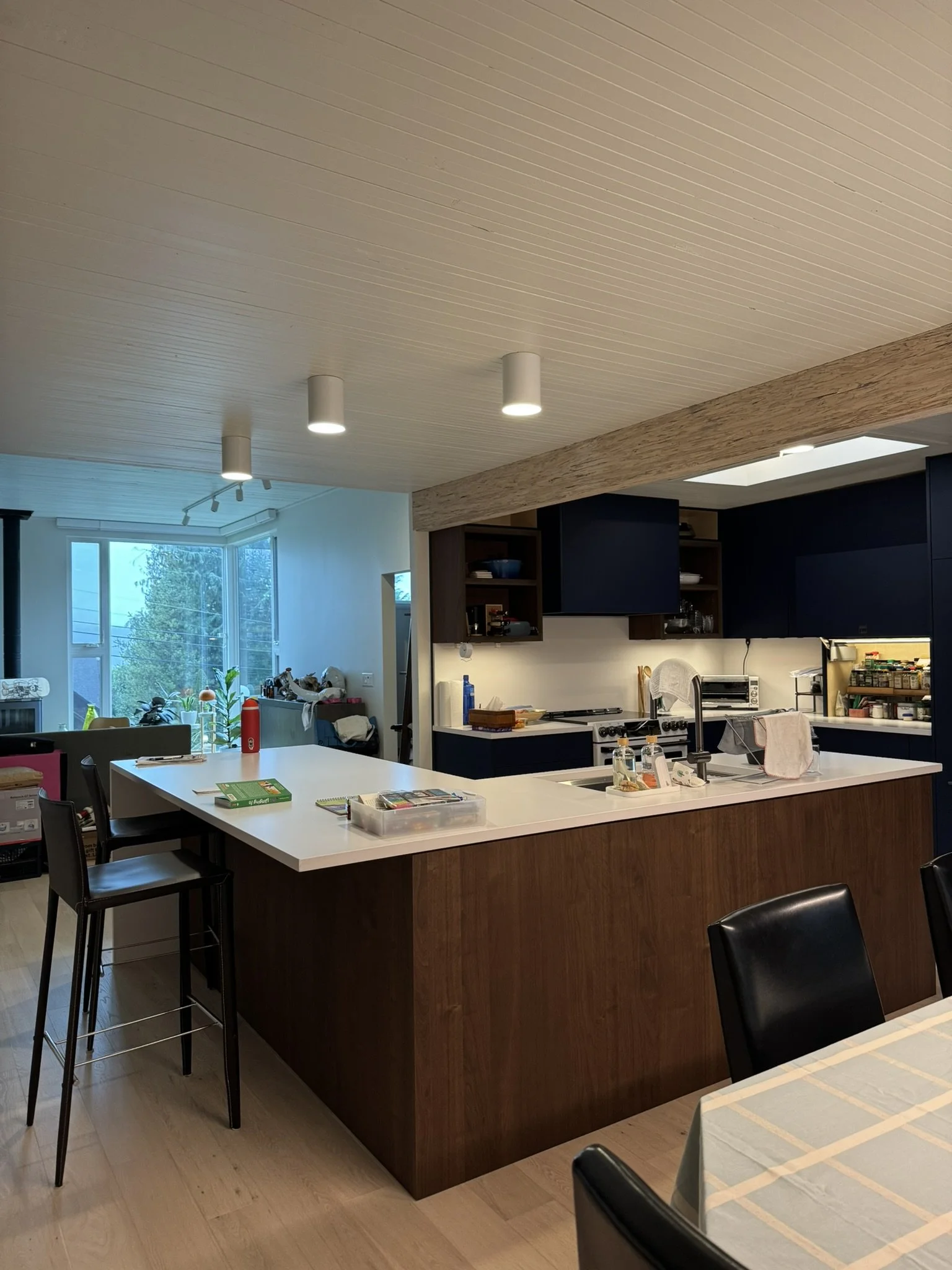We reorganized how the kitchen actually works: where food is prepped, where people gather while someone cooks, how the space flows toward the deck and outdoor living. Light changed. The view came in. Daylight from different directions paints the room differently throughout the day. The cook stopped being alone.